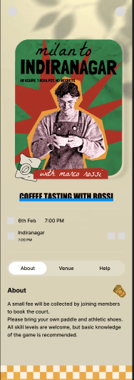 One of the key frictions for people to sign up for events lik these not being able to see what to expect at these, events i used motion to communicate this, also doubled down on the host as the hero as Airbnb usually does in their experience pages.